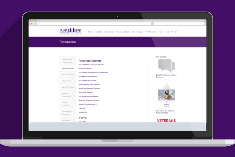 Purple Star Veterans is a program of Purple Star Veterans and Families (PSVF) a 501c3 community service organization. Our focus is on creating an atmosphere of support and advocacy by providing transition assistance through our Purple Star Peer Advisors, self-development tools and resources. We also offer qualified referrals to a growing national network of Veteran mentoring organizations.